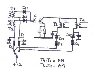 Met de schakelaar wordt op R 2 en R 3 een spanning aangesloten en nu gaan de diodes D2 en D3 geleiden . Omdat D 2 geleidt gaat het signaal via trafo T 2 naar de transistor en het versterkte signaal gaat via trafo T 3 verder . Immers diode D3 is ook geleidend . Tevens zijn de andere dioden ( D1 en D4 ) gesperd vanwege het feit dat de katodes een hogere spanning hebben dan de anodes . De trafo’s die niet in gebruik zijn , beïnvloeden dus de andere niet . Zetten we nu de schakelaar in de andere stand dan gaan dus diodes D1 en D3 geleiden en nu gaat het signaal via de 10,7 MHz trafo T1 naar de transistor en via T4 er uit . Nu zijn de diodes D2 en D3 gesperd . Zo kunnen we dus diodes als bandschakelaar toepassen . Nu zal men zeggen er is toch nog een schakelaar ? Ja dat is zo , maar deze kan erg eenvoudig zijn en .. de draden er naar toe mogen erg lang zijn omdat ze HF ontkoppeld zijn .
