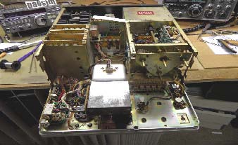We beginnen met het verwijderen van diverse knoppen van de frontplaat en dan kan deze naar voren worden geklapt . De Unit zit dan rechts vooraan in de set . Nu moeten eerst de kettingen worden verwijderd … echter ook de kettingen van de Bandschakelaar .. op de RX en de TX module zitten deze bandschakelaars met elk 3 dekken . Maar ook op nog een 3de unit zit zo’n bandschakelaar . De Local Unit , de frequentie fabriek van de set zogezegd , is die 3de unit .