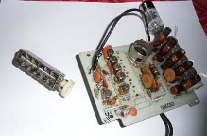 Hierbij moet worden gelet op de stand van de diverse schakelaars .. deze moeten alle bij terug inbouw van de Module weer in de goede stand staan . Nadat de kettingen weg genomen zijn kan de unit na wat schroef en soldeerwerk uit de set worden genomen . Unit op de kop gelegd en met de tinzuiger alle contacten van de 6 voudige conden sator los maken . Nu zou de condensator eruit moeten kunnen , maar … tegenvaller , de schakelaar zit in de weg . De condensator komt niet vrij van de print , dus moet de bandschakelaar er ook uit !