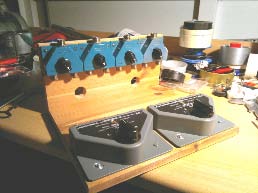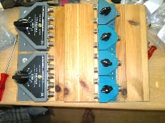 Nu moest ik het alleen nog zó aan elkaar maken, dat ik makkelijk bij de knoppen kon en ik ook goed kon zien in welke stand elke schakelaar stond. Daarom heb ik het op twee plankjes gemonteerd, die haaks op elkaar staan. Het geheel moest zo compact mogelijk worden. Daarom raadde een bevriend amateur mij Ecoflex 10 aan, vanwege de kleine buigstraal. Helaas zijn de goedkope PLstekers dan niet meer bruikbaar, omdat die de afscherming van de Ecoflex beschadigen, maar nu ik betere stekers gevonden heb, komen er geen andere meer in.