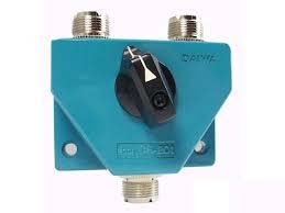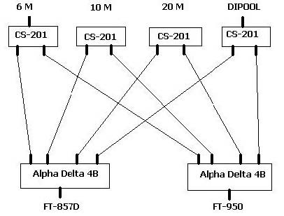 Daarom heb ik besloten voor de ‘gulden middenweg’ te gaan en het geheel met coax schakelaars uit te voeren. Makkelijker dan een ‘patch panel’, goedkoper dan een kast met coax relais, geen voedingsspanning nodig, en je kunt niet per ongeluk in een ontvanger ingang gaan zenden. Zo ziet het schetsje eruit. 4 stuks 2standen schakelaars en 2 stuks 4standen schakelaars: Oh, ja, ik had al een stel Daiwa schakelaars, dus wilde ik het liefst op die weg verder, maar de Daiwa CS401 wordt niet meer gemaakt. Op zoek naar een alternatief kwam ik er één van Alpha Delta tegen met alle connectoren aan één kant. Dat kwam zó goed uit, dat het die schakelaar geworden is.