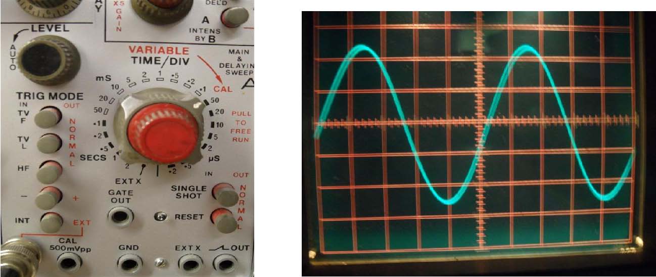 Deze staat op 0.1 mSek . ( tijd per cm ) We kunnen zien dat 1 sinus ongeveer 5,2 cm lang is, dit dan vermenigvuldigd met de stand van de tijdbasis >> 5,2 x 0.1 = 0,52 mSec. Dus dit is de factor T. T = 0,00052 Sec . ( mSec is een duizendste sec )