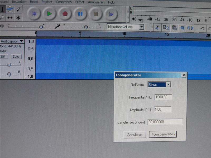 Nu methode b Vergelijken met een andere ( ijk ) frequentie. Als meetinstrument gebruik ik mijn gehoor, dat is best selectie ! Er bestaat een mooi programma voor de PC , n.l. Audacity . Een redelijk klein programma waarmee je bijv. platen en cassette bandjes kunt overzetten op CD. Maar dit programma heeft ook een nauwkeurige toongenerator .
