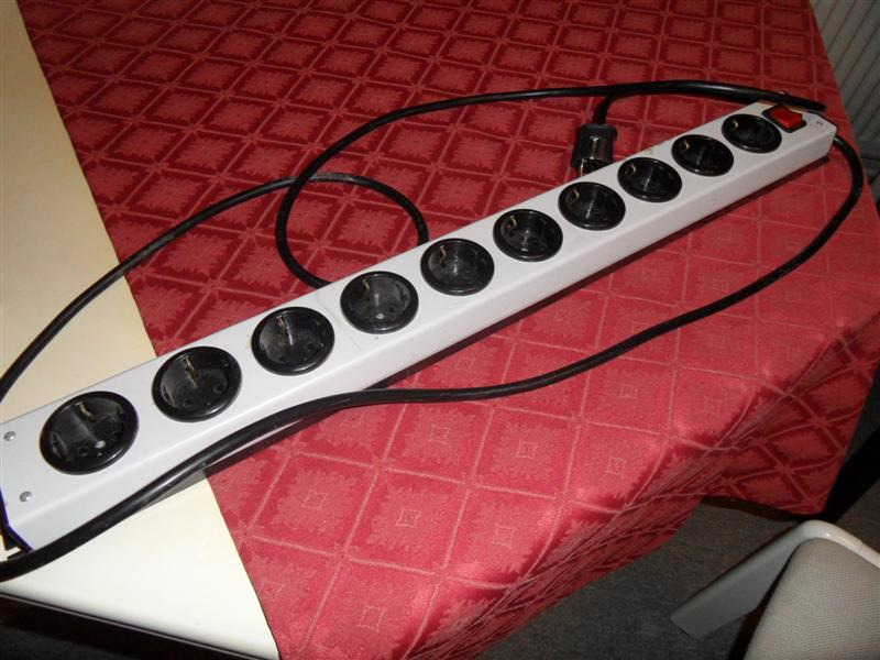 Wie kan dit gebruiken … balk met 10 wandcontactdozen . Ik heb de schakelaar overbrugd, die kan er niet tegen, die grote schakelstroom ! Als er meerdere gegadigden zijn, zal ik door loten vaststellen wie hem krijgt.