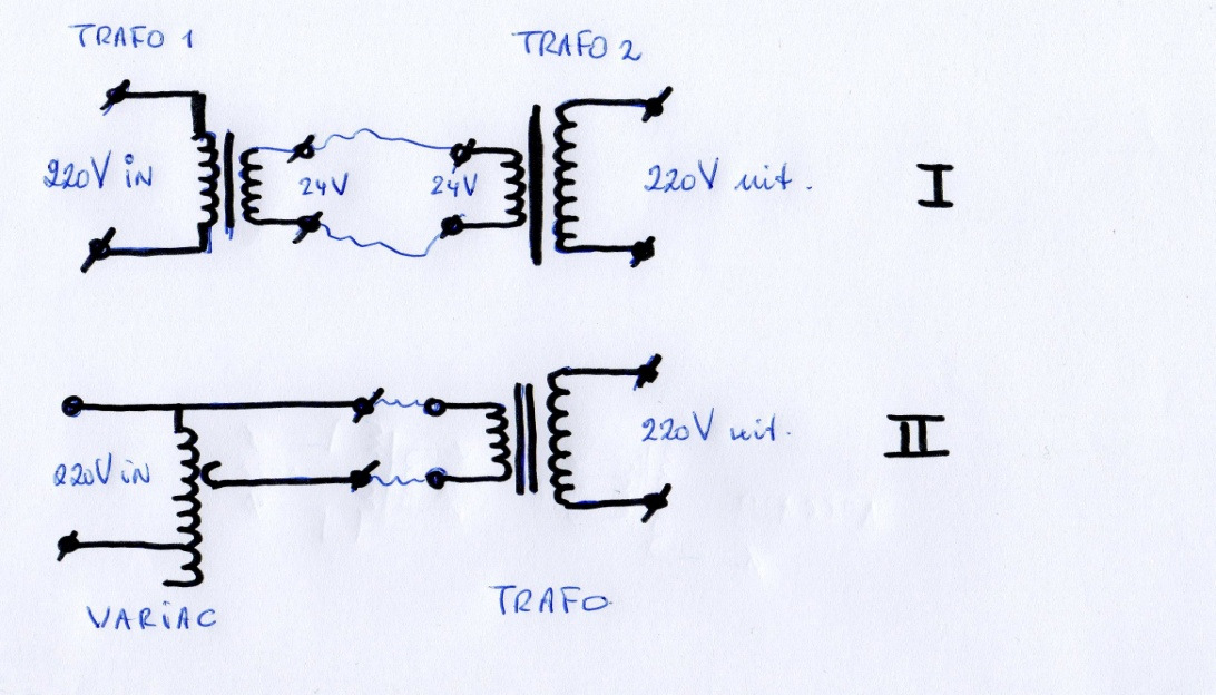 In schema 1 zien we 2 trafo’s . Enige voorwaarde is dat ze beide dezelfde uitgangsspanning hebben , bijv. 12 of 24 Volt . Men verbindt de beide secundaires aan elkaar . Sluiten we nu de linker trafo aan op het net , dan komt er bij de rechtse trafo 220 V uit en … we zijn gescheiden van het lichtnet ! In schema 2 heb ik , omdat ik die toevallig heb , een z.g. Variac gebruikt . Pas op , dit zijn z.g. autotransformatoren .. men ziet dat de uitgang WEL met het lichtnet is verbonden . Nu heb ik weer een transformator aangesloten .. de secundaire is op de variac aangesloten en de “ primaire “ van de trafo is nu onze, van het lichtnet gescheiden, 220 Volt. Voordeel is nu dat de keuze van de transformator nu niet vast ligt, alle uitgangsspanningen zijn toepasbaar, bijv. 24 Volt of 45 Volt . Nu draait men de variac langzaam op tot er 220 Volt wordt gemeten aan de primaire wikkeling van de transformato . Let er wel op het vermogen van de trafo’s niet teveel geweld aan te doen. Hiermee kan nu veilig worden gewerkt aan dit soort radio’s en andere apparaten .