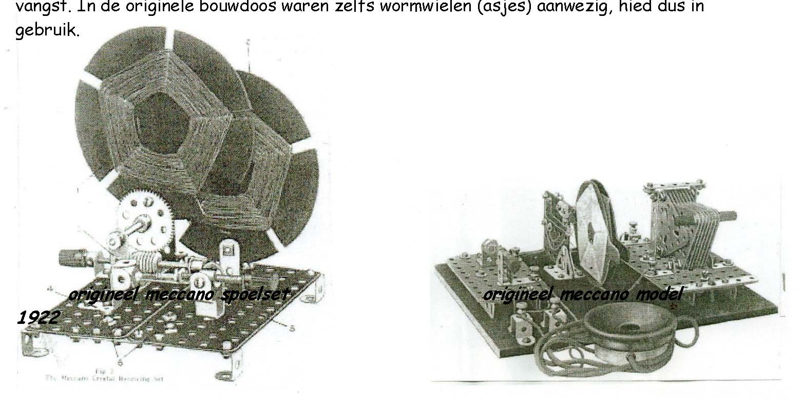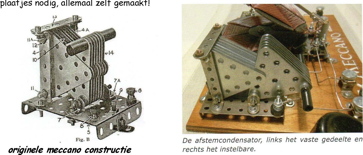 In onze onvolprezen leesmap trof ik weer eens het blad Radio Historisch Tijdschrift en in nummer 1 van 2016 was er een pracht artikel geplaatst over een radio gemaakt met Meccano. Nu bestaat dit merk niet meer, het waren constructie-bouwdozen waarmee je allerlei leuke en leerzame projecten kon maken. Bekend misschien bij velen zijn de rood of blauw gekleurde plaatstalen onderdelen welke rijk waren voorzien van gaten teneinde allerlei constructies mo-gelijk te maken. Er waren ook hoekstukjes en asjes enz. bij. Ik vond het daarom zo leuk omdat ik in mijn jonge jaren deze meccanodozen kreeg van de Sint. Je begon met een eenvoudig doosje en de vervolgdozen waren dan uitgebreider en kon je meer dingen maken. Heel leerzaam en altijd kwam ik dan wel boutjes en moertjes M3 te kort. Maar nu blijkt dat Meccano ook een radiobouwdoos had uitgebracht, naar mijn weten niet in Nederland bekend. Tenminste ik heb daar nooit iets over gezien. In het artikel in de RHT zien we hoe Tom Rentmeester een replica maakt van de kristalontvanger uit 1922. Dus , met mecca-no onderdelen. En het gaat hier om model nr2 . Zie bijgaande afbeelding.