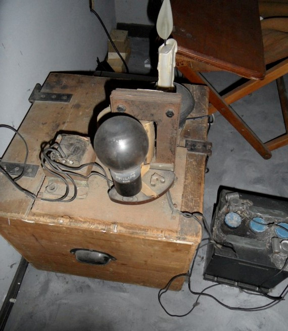 Heel mooi, maar ik kan er eigenlijk geen radio in herkennen. Staat wel een mooie lamp op de plank. Het is nog wel een Philips exemplaar. De accu zal wel zijn voor de gloeidraadvoeding. De grote spoel met lamellenkern, zichtbaar achter de lamp kan ik eigenlijk ook niet zien als een onderdeel voor radio-ontvangst. Of, als het een zender is zou het misschien een modulatietrafo kunnen zijn. Maar .. de kist bevat misschien wel wat meer, daar konden we niet inkijken. Misschien is er iemand uit onze gelederen die er wat meer van weet.
