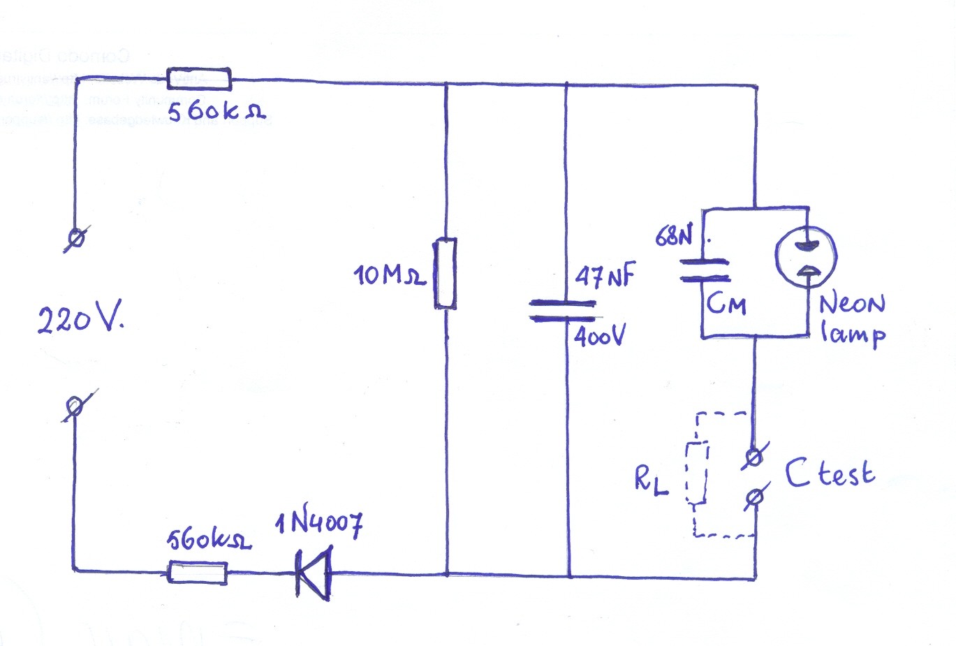 De condensator Cm van 68 nF ( 0,068 microF ) wordt via de lekweerstand Rl van de te testen condensator opgeladen en dat gaat door tot de ontsteekspanning van het neonlampje wordt bereikt . Bij het ontsteken van het lampje wordt de condensator Cm meteen ontladen en dan begint het laden weer opnieuw . Zo ontstaat er een zaagtand over C test . Het lampje knippert aan .. uit .. aan .. uit .