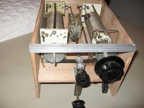 Zoals te zien op de foto, zit nu de oorspronkelijke bodem op zo’n 10 cm van onder. Aan de onderkant huizen nu de ingangsC en de balun. Lekker toegankelijk Bovenin de twee rolspoelen met daartussen de uitgangsC. Overigens :beide C’s zijn omroepC’s. Dus niks grotere plaatafstand. Met 100 watt is dat geen probleem, als je maar afstemt met qrp, dus een wattje of 5. Ik heb nog nooit een vonkje gezien. Door voor de C’s andere exemplaren te nemen, met grotere capaciteit, lukt het nu om de dipool (twee keer 15.60 m) af te stemmen van 10 tot 80 meter. 160 meter lukt niet met dit apparaat. Maar dat hoeft ook niet, een andere tuner uit de collectie doet dat inmiddels zonder morren. Het ging om het experiment en dat kan als geslaagd worden beschouwd, diverse verbindingen in Europa zowel als over het grote water konden gemakkelijk worden gemaakt.