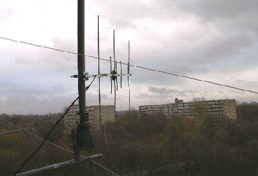 Op de volgende foto staat de A1430S7, dit is een dual band antenne voor 2mtr en 70 cm en 7 elements. De afmetingen zijn 1.25 mtr lang en 1.00 breed, het gewicht is nog geen kilo. De antenne is zowel horizontaal als verticaal te gebruiken. Bij mij staat hij op een rotor verticaal 180 graden half rond te draaien. Max vermogen in de antenne is 100 Watt, maar met 25 Watt is Rotterdam redelijk haalbaar. Dit komt natuurlijk ook omdat ik de hoogte mee heb.