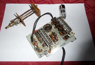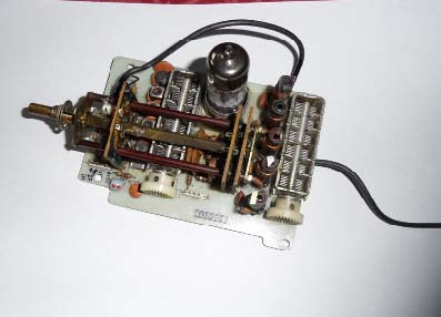 Hierbij moet worden gelet op de stand van de diverse schakelaars .. deze moeten alle bij terug inbouw van de Module weer in de goede stand staan . Nadat de kettingen weg genomen zijn kan de unit na wat schroef en soldeerwerk uit de set worden genomen . Unit op de kop gelegd en met de tinzuiger alle contacten van de 6 voudige conden sator los maken . Nu zou de condensator eruit moeten kunnen , maar … tegenvaller , de schakelaar zit in de weg . De condensator komt niet vrij van de print , dus moet de bandschakelaar er ook uit !