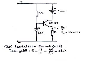 Met slechts 4 onderdelen en een externe voeding zijn we er … de schakeling werkt als volgt … de basis van de NPN ( BD139) is 6,2 Volt vanwege de zener . Als gevolg daarvan is de emitterspanning ongeveer 0,6 Volt lager , dus 5,6 Volt . Meet even de emitterspanning na want er kunnen kleine afwijkingen zijn . Door nu de emitterweerstand een bepaalde waarde te geven kiezen we de laadstroom . In het voorbeeld kiezen we een laadstroom van 200 mA ( 0,2 A ) Nu geldt R = U : I . >>>> R = 5,6 : 0,2 = 28 ohm . Hierbij stellen we dat Ie gelijk is aan de collectorstroom Ic . ( eigenlijk : Ie = Ic + Ib )