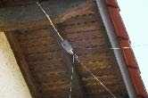 Hier zie je links de ‘Slappe Arnold’ voor de 2 meterband. Rechts hangt het voedingspunt van de InvertedV, gemaakt van een zeer kort stuk PVCafvoerbuis.