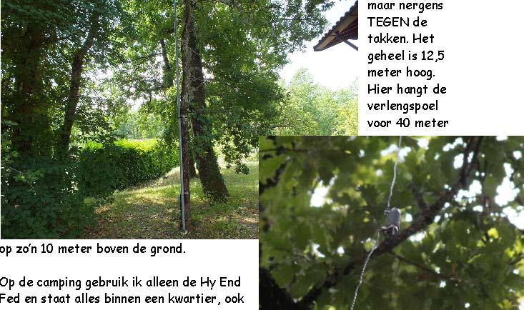 De uitschuifmast steunt op een boom en de draad hangt TUSSEN de takken, maar nergens TEGEN de takken. Het geheel is 12,5 meter hoog. Hier hangt de verlengspoel voor 40 meter