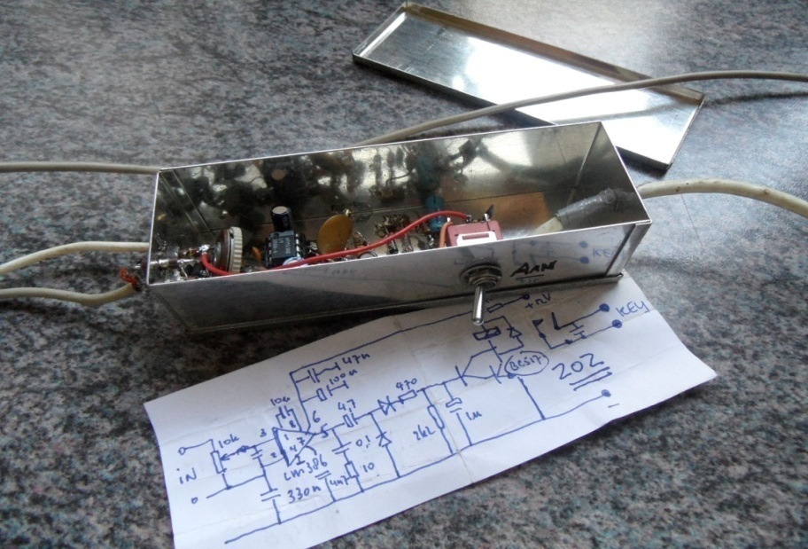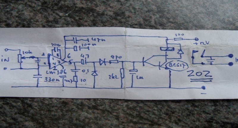 Hierbij nog even het schema … het signaal komt via de LM386 op een diode verdubbelaar en de spanning daaruit schakelt de Darlington waardoor het relais schakelt in het ritme van de CW signalen. Dat laatste is niet nodig , dus heb ik alleen de darlington ( BC517) in gebruik. De collector/emitter werkt nu als schakelaar en dat is dus het key signaal( gesleuteld open/dicht contact). Zelfs één BC547 doet het !