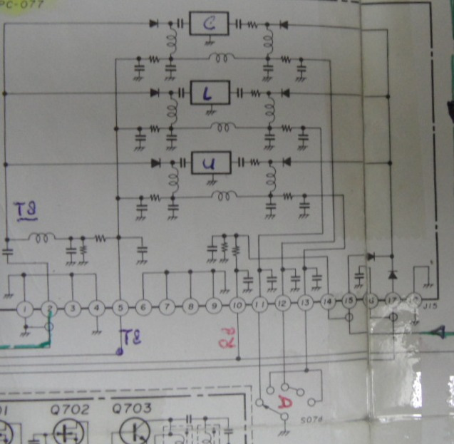 In bovenstaand schema ziet u dat met schakelaar D een filter kan worden gekozen voor USB , LSB of CW. De punten 11 , 12 of 13 worden dan geaard via de draaischakelaar . Dus … bij deze storing dacht ik aan vuile contacten of erger .. aan een versleten schakelaardek. De massa draden die ik aantrof nodigde niet bepaald uit tot uitsolderen van de schakelaar . Enige spray leek even te helpen maar de fout kwam toch weer terug .