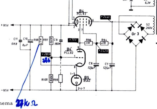 Daar waar 27 kohm bij staat, de weerstand die de stab.buis van spanning voorziet. ( gewijzigd van 47 kohm naar 27 kohm ) Eruit met dat ding en eens meten …