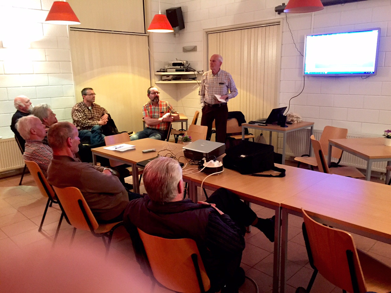Na wat technische strubbelingen konden we genieten van een mooie, boeiende lezing over de Intruder Watch door Dick, pa2gru . Hij deed dat op leuke, ontspannen wijze en hij kon met beelden en geluiden ons laten zien wat er zo allemaal op de diverse banden loos is. En .. dat is heel wat! Ja, de problemen met de beamer werden niet opgelost maar gelukkig hangt er een pracht TV toestel en daarop kon de laptop worden aangesloten. Misschien kan dat wel vaker zo worden gedaan. Na een flink applaus en een lekker kaasje rijker kon Dick met een tevreden gevoel weer naar huis .