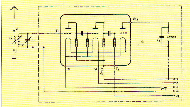We zien hier de schematische voorstelling van de lamp, er is weerstandskoppeling toegepast, toen nogal ongebruikelijk. Altijd werd transformatorkoppeling gebruikt om de stuurroosters hoogohmig te belasten. Ook werden de lagere tonen minder versterkt maar de jonge bedenker loste dit op door de spiraal van de stuurroosters een speciale vorm te geven. Hier de lamp in detail, iets zichtbaar zijn de weerstanden en condensatoren in de ballon. Deze onderdelen waren in kleine dichtgesmolten glazen buisjes opgesloten, ook al speciaal bij Loewe gefabriceerd. Om een radiotoestel te maken waren er door toepassing van deze speciale lamp maar enkele externe onderdelen nodig zoals een spoel en een afstemcondensator. Accu’s, koptelefoon, antenne en aarde eraan en men kon radio ontvangen. Nu moet men zich van de gevoeligheid niet erg veel voorstellen en erg selectief zal het apparaat ook niet geweest zijn maar nu was de hoeveelheid zenders op de middengolf niet zo groot. Ook kan men uit de naam van het toestel misschien afleiden dat deze radio voor dichterbij ontvangst was gemaakt. De type aanduiding was OE, hetgeen komt van Orts Empfänger en dat betekent, als ik het wel heb, plaatsontvanger,waar mee dan plaatselijke ontvangst mogelijk zou zijn. Op de foto hieronder een afbeelding van de complete radio van Loewe.