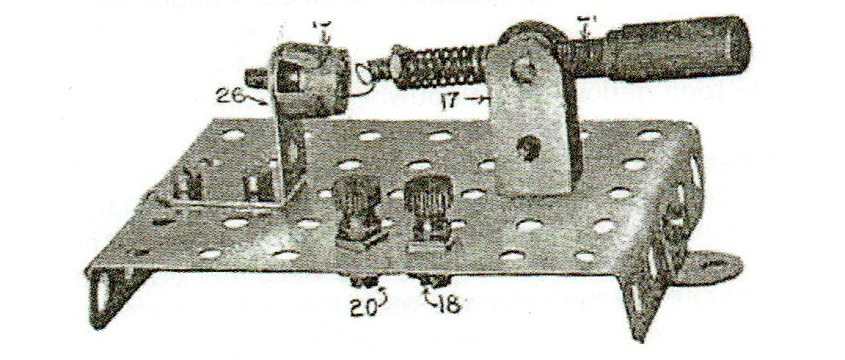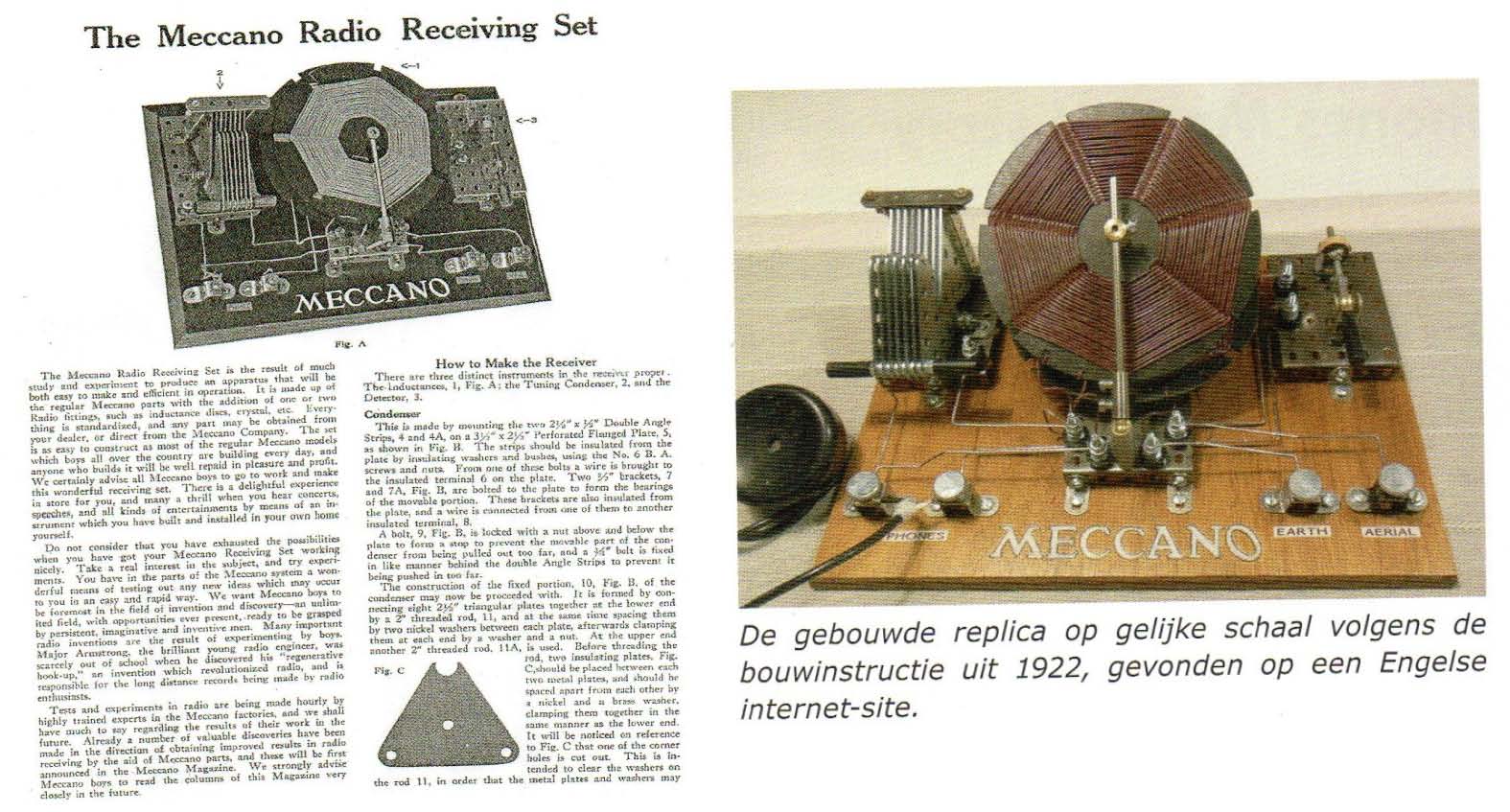 In onze onvolprezen leesmap trof ik weer eens het blad Radio Historisch Tijdschrift en in nummer 1 van 2016 was er een pracht artikel geplaatst over een radio gemaakt met Meccano. Nu bestaat dit merk niet meer, het waren constructie-bouwdozen waarmee je allerlei leuke en leerzame projecten kon maken. Bekend misschien bij velen zijn de rood of blauw gekleurde plaatstalen onderdelen welke rijk waren voorzien van gaten teneinde allerlei constructies mo-gelijk te maken. Er waren ook hoekstukjes en asjes enz. bij. Ik vond het daarom zo leuk omdat ik in mijn jonge jaren deze meccanodozen kreeg van de Sint. Je begon met een eenvoudig doosje en de vervolgdozen waren dan uitgebreider en kon je meer dingen maken. Heel leerzaam en altijd kwam ik dan wel boutjes en moertjes M3 te kort. Maar nu blijkt dat Meccano ook een radiobouwdoos had uitgebracht, naar mijn weten niet in Nederland bekend. Tenminste ik heb daar nooit iets over gezien. In het artikel in de RHT zien we hoe Tom Rentmeester een replica maakt van de kristalontvanger uit 1922. Dus , met mecca-no onderdelen. En het gaat hier om model nr2 . Zie bijgaande afbeelding.