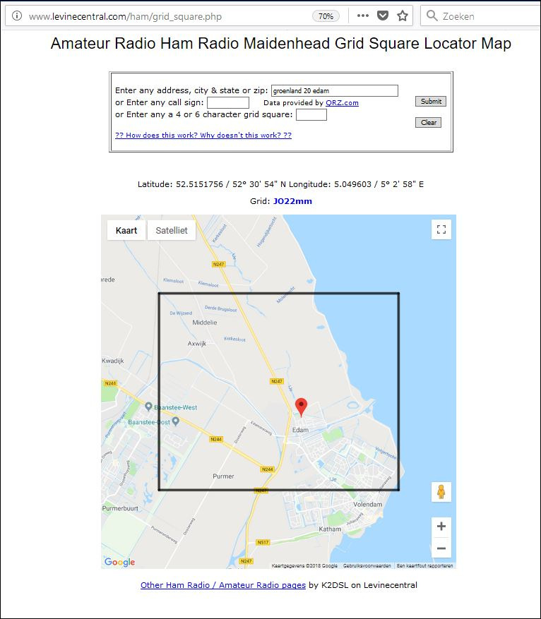 Als er een adres voorhanden is kan het ook anders. Op de website: http://www.levinecentral.com/ham/grid_square.php? kan je behalve op callsign ook op adres zoeken. Type het adres in of copy / paste het van QRZ.com of iets dergelijks en er verschijnt een QTH locator met een kaart met daarop aangegeven dat locator vak. Hier een voorbeeld met mijn eigen adres: