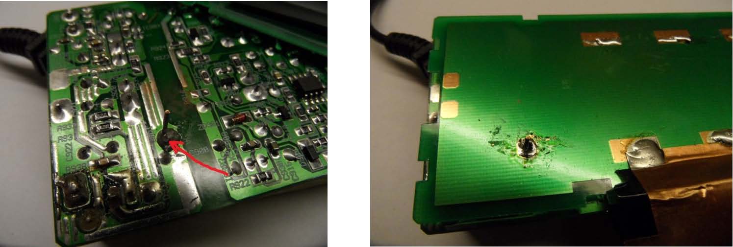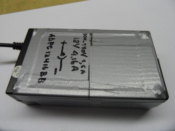 De onderkant van de voeding was voorzien van een afschermplaat en nu bleek dat van de 2 soldeerpunten er één niet meer was verbonden met een massa contact op de print. Hier het door mij opnieuw aangebracht stukje montagedraad op de print welk door de afschermplaat steekt. (rode pijl) Het ziet er natuurlijk niet meer heel netjes uit . Lijmen van de beide helften van de behuizing was eigenlijk niet te doen omdat er toch wel wat schade was aan de randen van de delen. Maar met tape gaat het ook en … de storing is weg !! Waarom ik dit schreef … velen en ik dus ook, vinden schakelende voedingen erg lastig om te repareren en vaak denk je dan om die maar weg te gooien . Maar eerst toch even erin kijken kan geen kwaad. Soms zijn het inderdaad ontbrekende condensatoren en daar zijn soms ook elco’s bij. Maar ook soldeerfouten komen best wel vaker voor. Alleen jammer dat het openen van de behuizing meestal alleen met wat geweld mogelijk is.