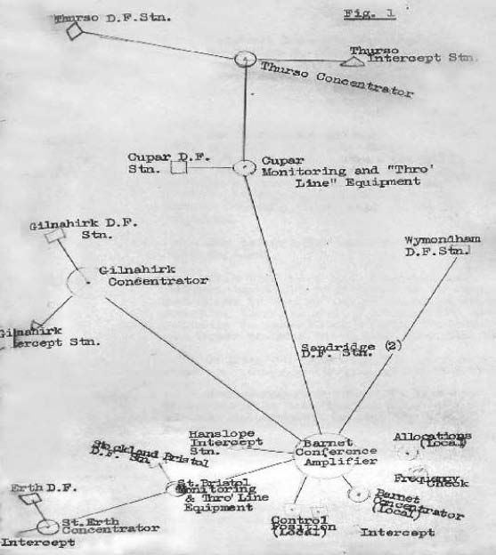 Direction Finding reporting en plot Controle van de D/F stations geschiedde vanuit Barnet en Hanslope Park, gelegen in Noord London. De plotkamer in beide locaties ontving de peilingen van de D/F