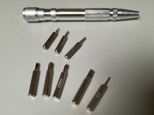 Het is een schroevendraaiersetje en het bevat 8 bitjes . In mijn setje zitten 3 stuks kruiskop PH000, PH00 en PH0; 3 stuks torque 0,9, 1,0 en 1,5 mm. en 2 stuks beitelmodel 1,5 mm. En 3,5 mm. Mis ik een beiteltje ?