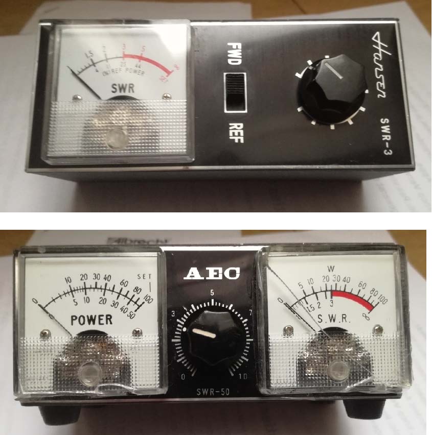 De Hansen meter heeft ook een antenne aansluiting, dus ook als veldsterkte meter te gebruiken. Deze meter werkt zelfs op 70 cm. De AEC SWR-30 heeft twee meters , alleen is een kunststof meterglas voorzien van een barst. Werkt evengoed .. goed, hi. Dus voor liefhebber .. voor geen geld leuke metertjes .
