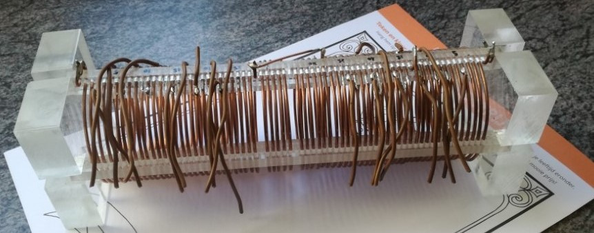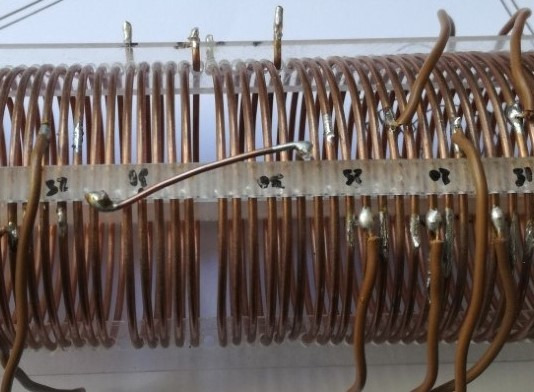 In het midden zijn duidelijk de twee delen van de primaire spoel te zien. We zien daar 2 x 5 windingen. De schuine draad is de doorverbinding van de beide helften van de secundaire spoelen. Het voordeel van deze 2 spoeldelen aan weerszijden van de primaire is dat de capaciteitslek tussen primair en secundair zeer gering is. In het schema van de tuner is te zien dat de lussen A en B op diverse aftak-kingen van de secundaire spoel worden geclipt waarmee de zelfinductie wordt gekozen voor diverse banden. Ook de feeders op C en D moeten op gekozen punten van de secundaire spoelen worden geclipt. Lijkt veel werk, maar na wat ervaring is het clippen van 4 draden snel gedaan. Dus … is er iemand die deze mooie spoel wil gebruiken … graag, want weggooien is een beetje zonde van het werk waarmee ik deze spoel heb gemaakt.
