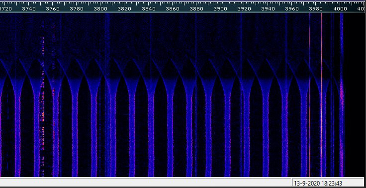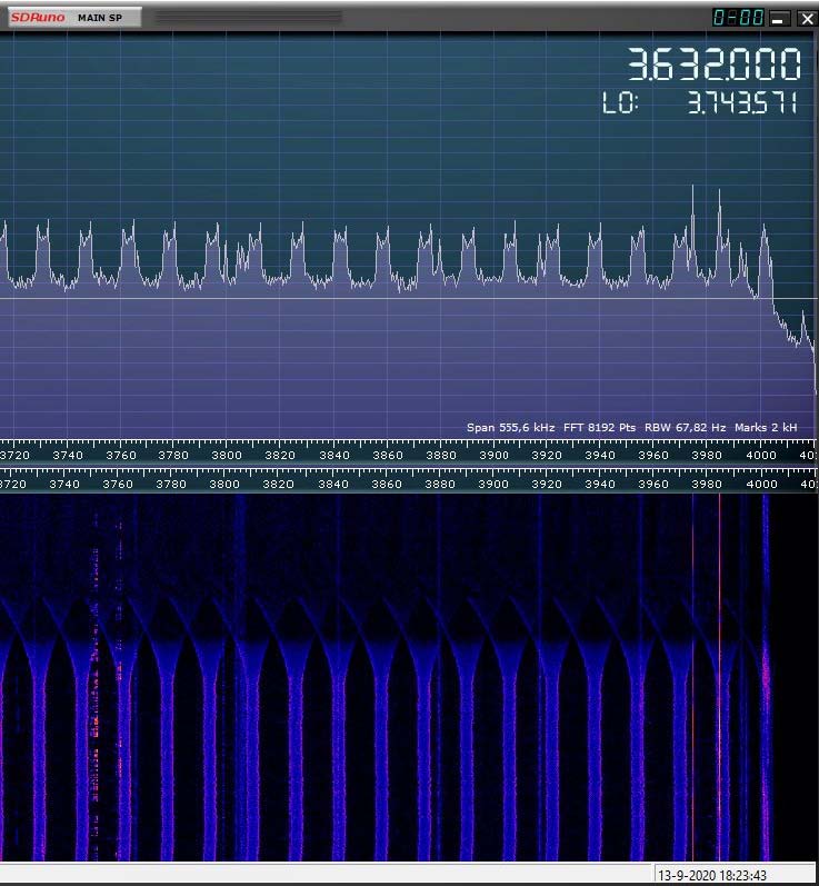 Misschien denkt iemand: maar hoe zit dat nu met de douche? Nou, ik ben nu met pensioen en dat was een mooie gelegenheid om de hobby nieuw leven in te blazen. Antennes voor 2 meter, 70 centimeter en 137 MHz op het dak en voor HF een simpele draad antenne. Als ontvanger een SDRplay met SDRuno software. De ontvangst op HF viel mij niet tegen, nou ja…. boven 5,5 MHz dan. Want wat was daaronder nou aan de hand? Allemaal signalen van ongeveer 3kHz breed (Afb. 1), oplopend in sterkte en uitstervend in de middengolf, waar kwam dat nou vandaan? Door de problemen op de woningmarkt hebben wij nog twee inwonende kinderen met hun elektronische spullen. Verleidelijk om daar de schuld te leggen! Overigens niet lang want ze waren maar al te bereid om hun apparatuur uit te zetten en los te koppelen: zij waren het niet. De storing was er altijd, of nee toch niet, op een avond was het stil maar de volgende dag was het weer terug. De zonnepanelen misschien, nee die ook niet.